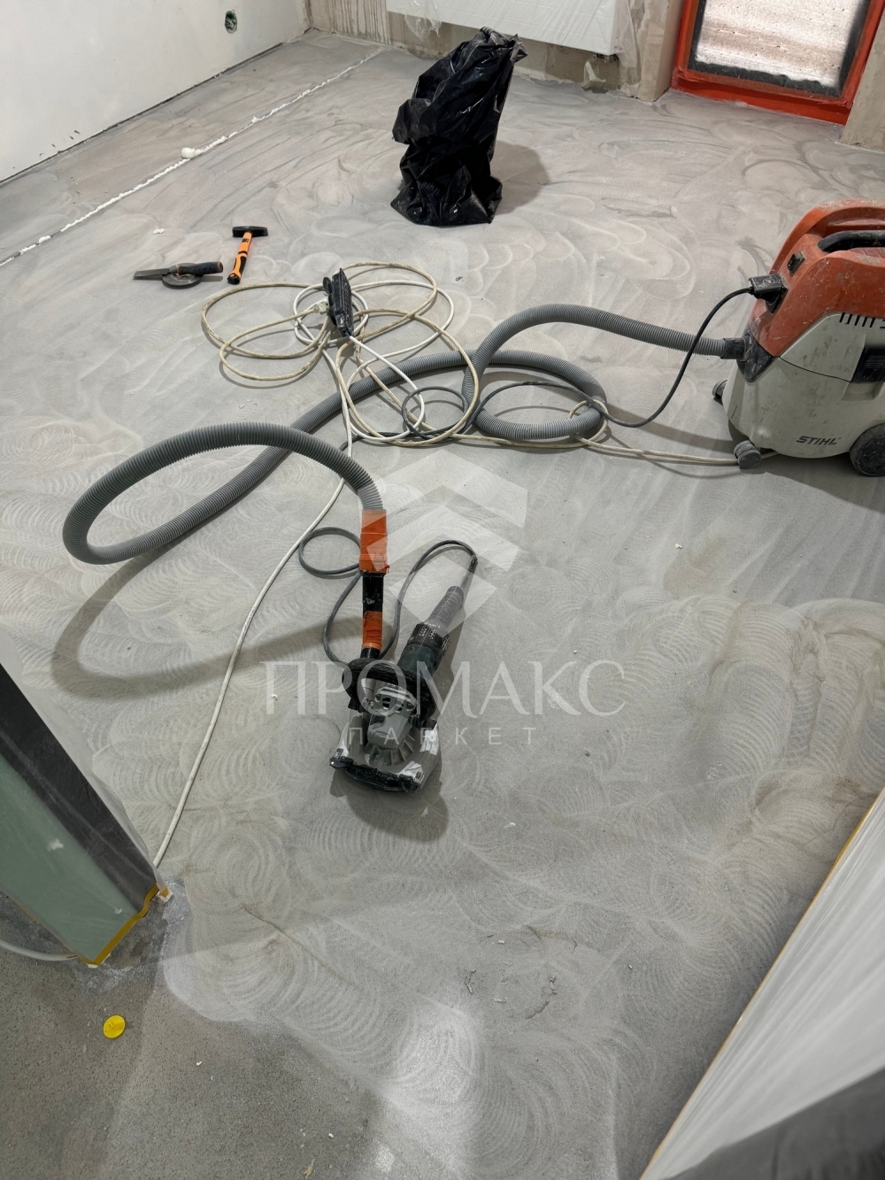 Отшлифовать основание от молочка и различных загрязнений. Открыть поры стяжке.